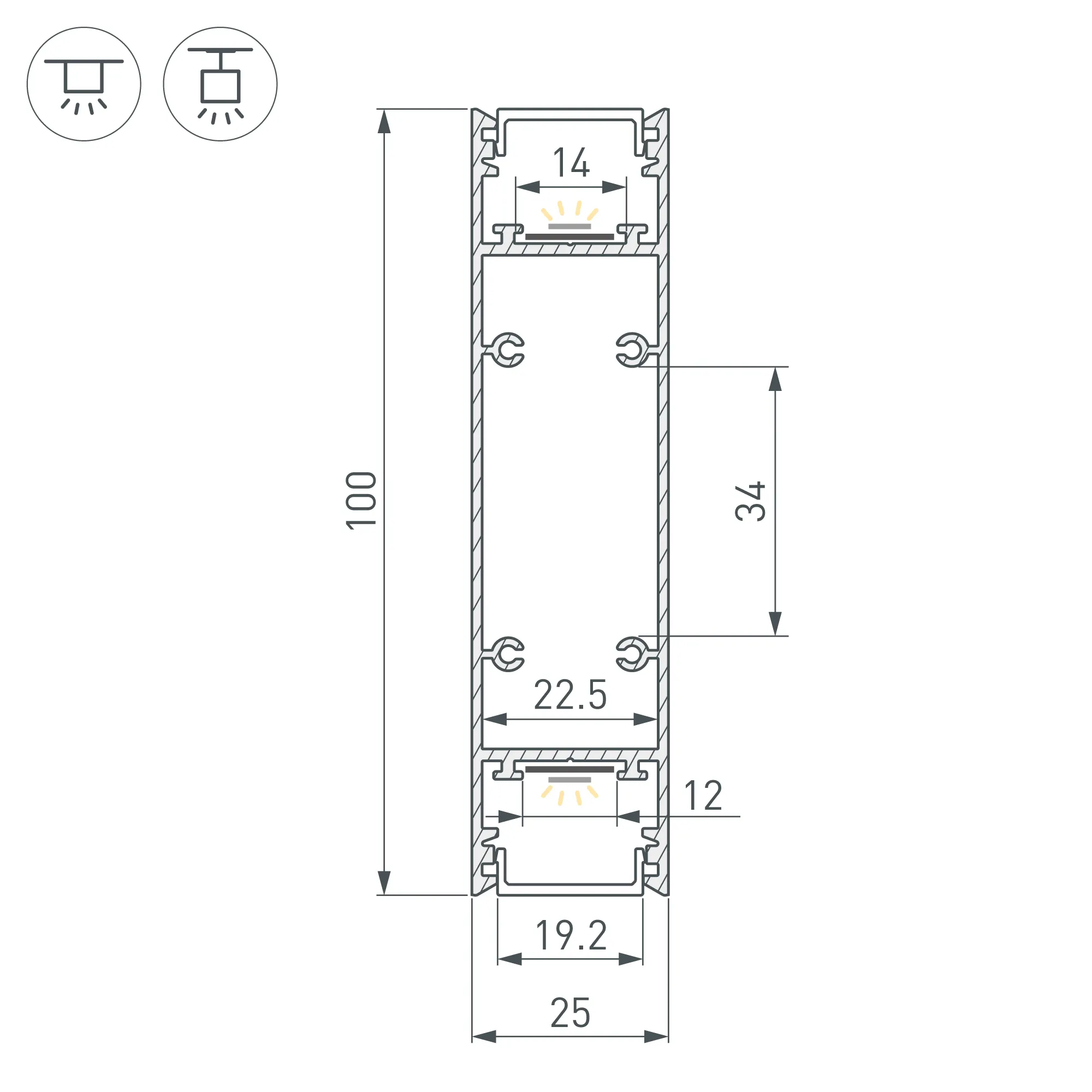 Под заказ от 100 м. Алюминиевый профиль для светодиодных лент и линеек, свечение вверх и вниз. Цвет - серебристый RAL9006 (порошковая окраска). Габаритные размеры (L×W×H): 2500x25x100 мм. Ширина площадки для ленты 12 мм. Экраны, заглушки и другие аксессуары приобретаются отдельно. Цена за 1 метр.