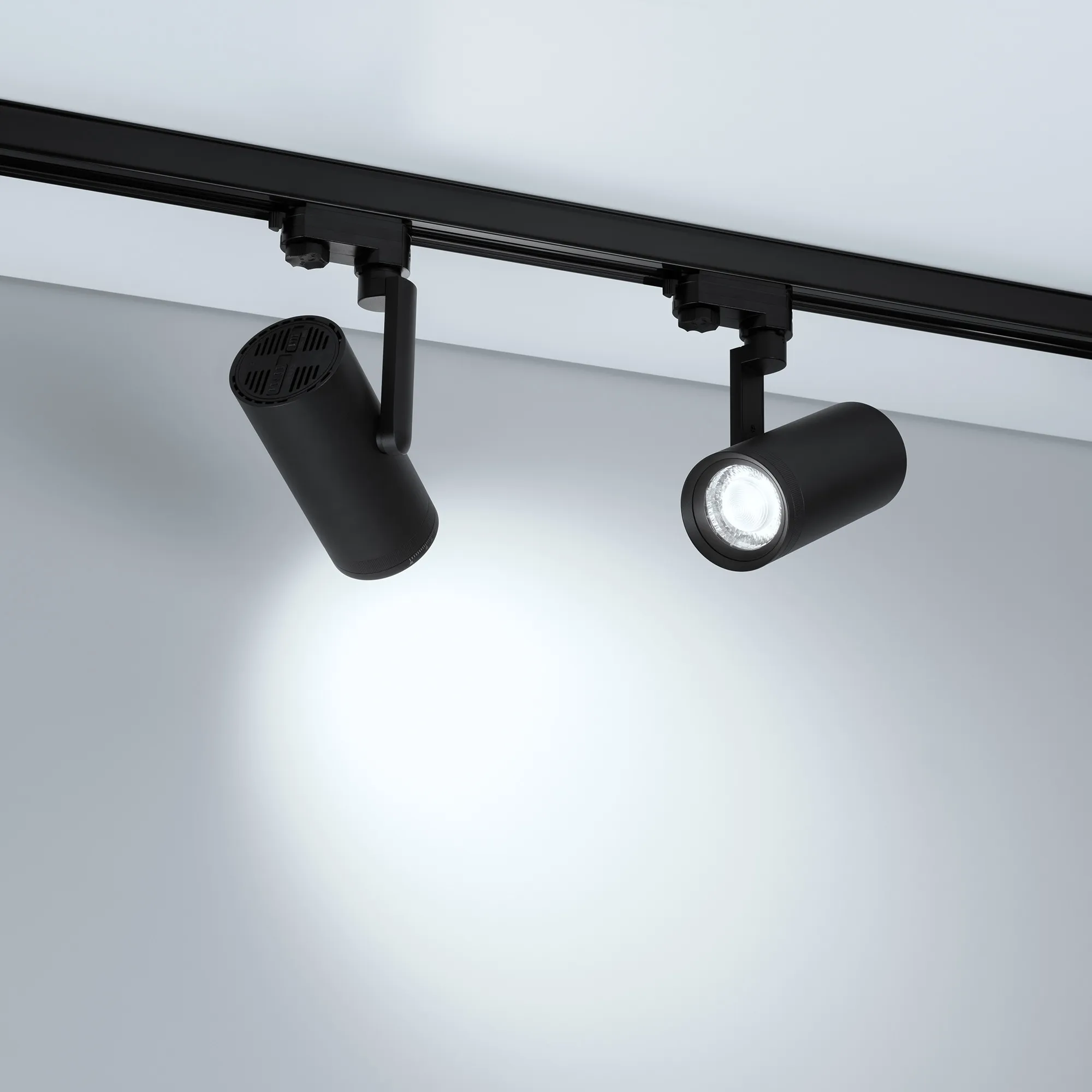 Светильник для треков/шин 4 провода, 18Вт/25Вт. Цвет свечения меняется в диапазоне 2700K/3000K/3500K/4000K/5700K (при помощи переключателя на корпусе), световой поток 1140-2075лм, регулируемый угол 20°-50°, CRI>90. Корпус круглый, металл, цвет черный, IP20. Угол наклона корпуса 90°, угол поворота корпуса 330°. Габариты LxWxH: 90х75x255мм. Размер модуля DxL: 75x165мм. Входное напряжение AC220-240V, мощность 25Вт.