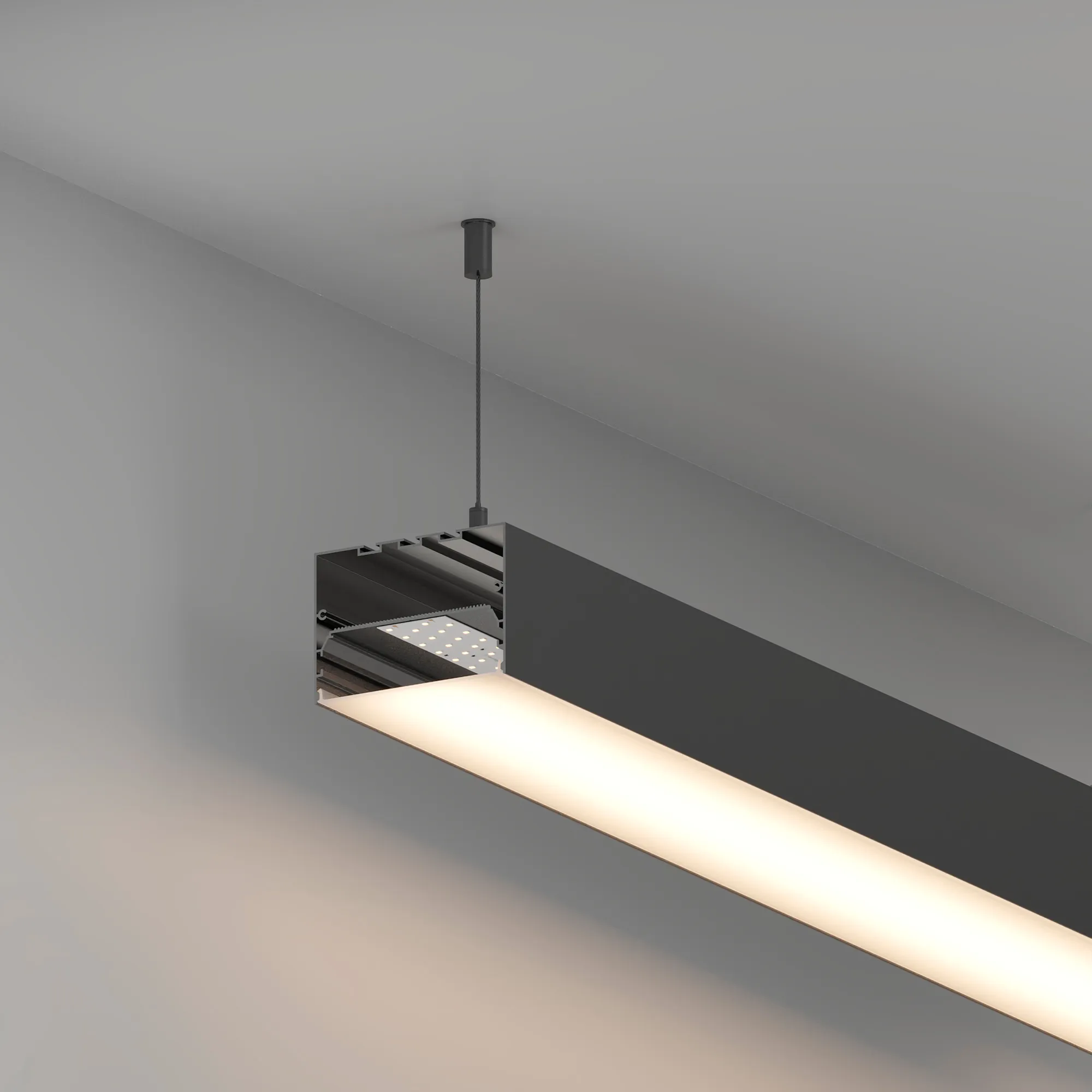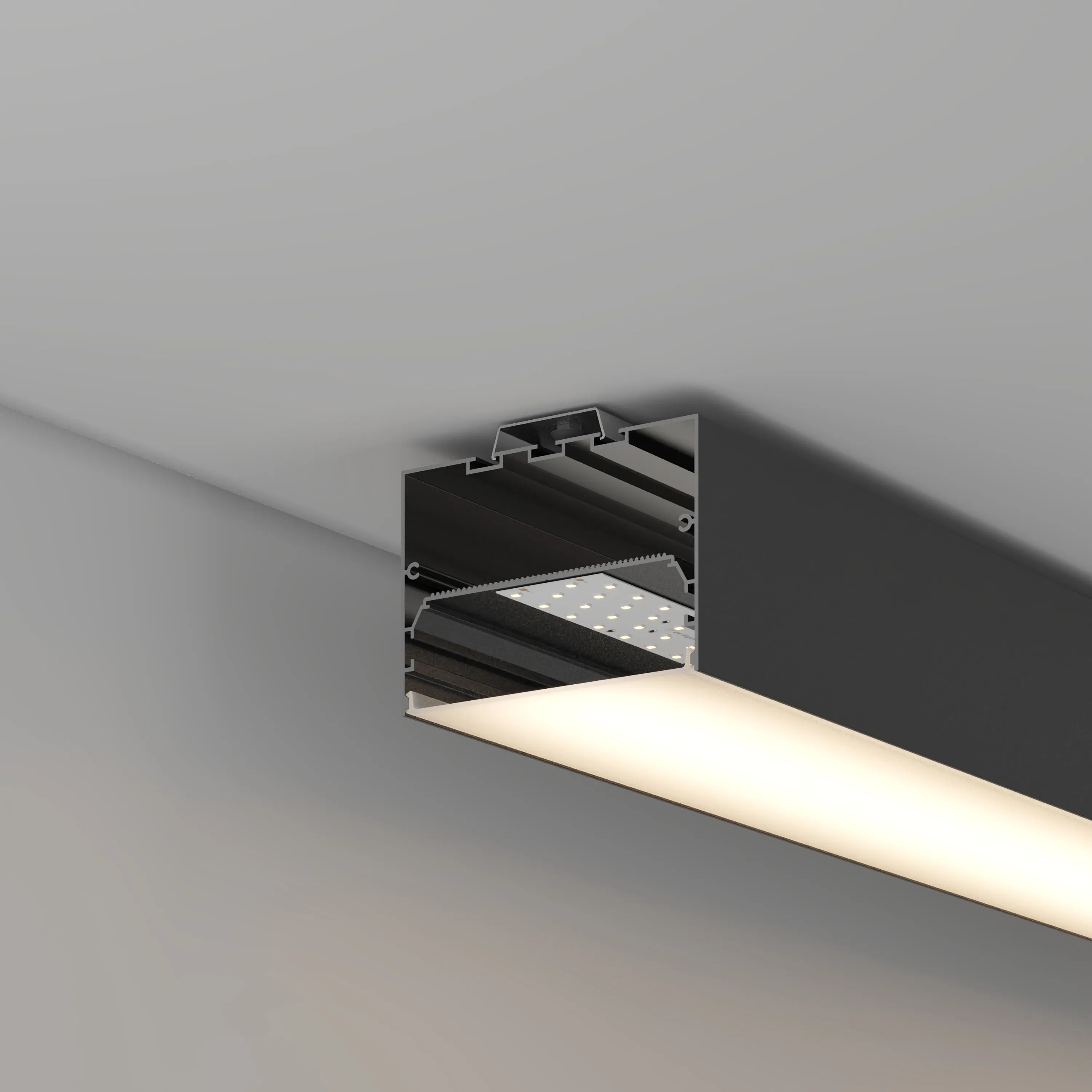 Алюминиевый профиль для светодиодных лент и линеек. Цвет - черный RAL9004 (порошковая окраска). Габаритные размеры (L×W×H): 2000x100x70,4 мм. Ширина площадки для ленты 80 мм. Размер отсека для блока питания: 87,2х32 мм. Экраны, заглушки и другие аксессуары приобретаются отдельно. Цена за 1 метр.
